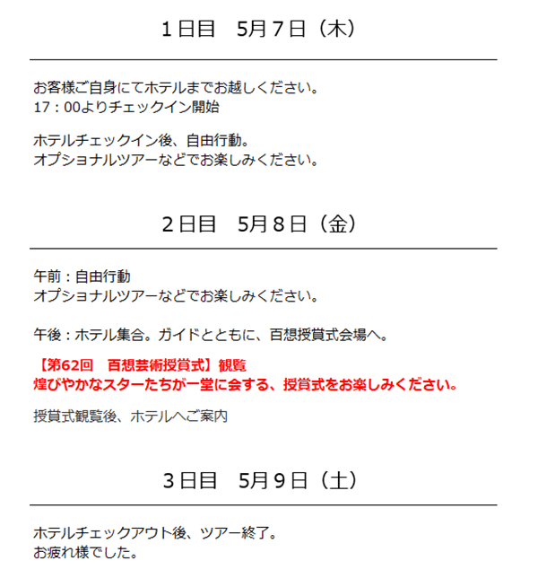 ※授賞式の観覧席は抽選での配席となります。ツアープラン、現地2泊プランによる優先順位などはございません。